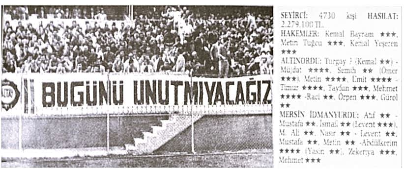 İzmir dışında üniversite tahsilimi yapıyordum. Maçlara gelemediğim yıllardı ama takip ediyordum. Altay yenilgisinden sonra şampiyonluk şansımız zayıflamıştı. Artık bu yarışta Altay ve Mersin İ.Y.’nun baş başa kalacağı anlaşılmıştı. Vize sınavlarından sonra İzmir’e tatile gelmiştim ve soluğu A.Ordu – Mersin İ.Y.maçında alıyordum.